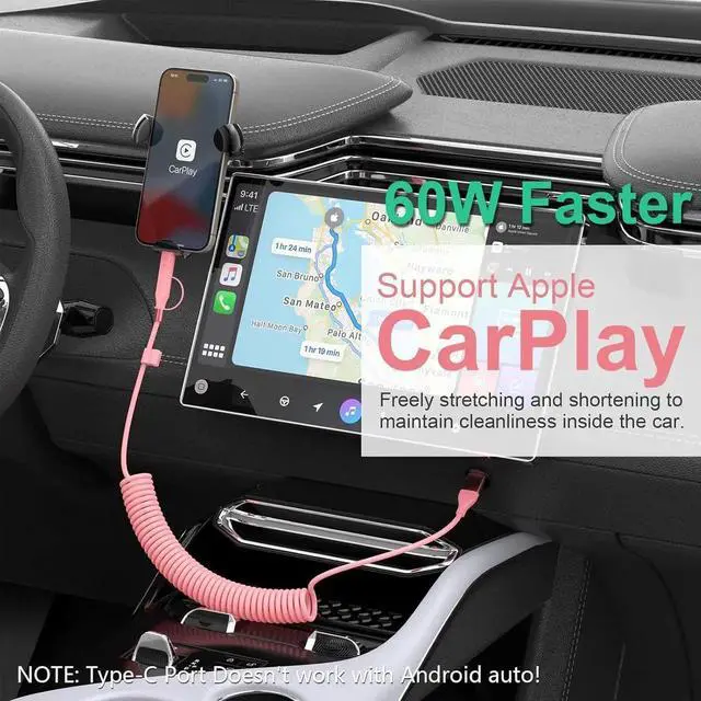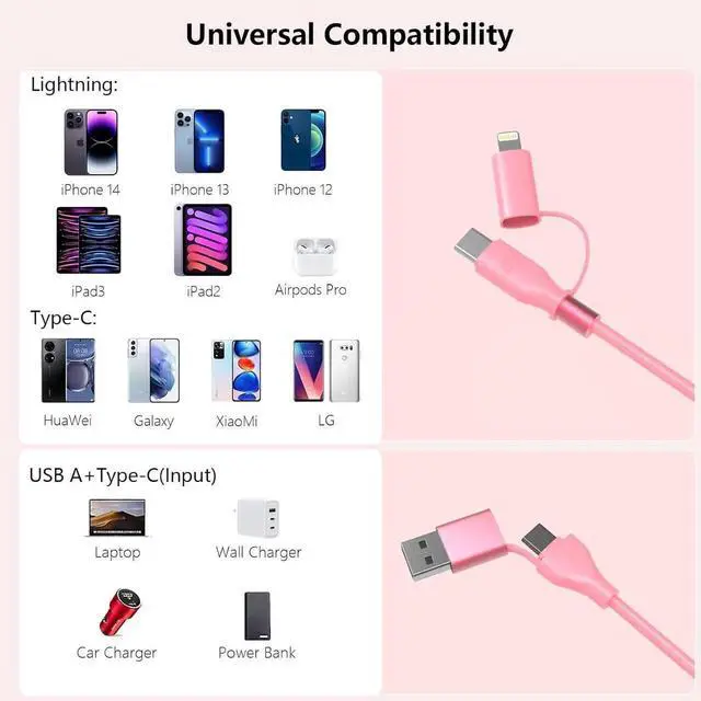 Versatile 4-in-1 DesignThis multiple 4 in1 Coiled USB C Lightning Adapter Cable is designed to simplify your charging setup. It combines four modes - USB A to C USB A to Lightning USB C to Lightning and USB C to USB C - in one cable. Keep your workspace clean with our efficient Multi USB 4-in-1 Charger CableUniversal CompatibilityUSB A/C to lightning cable supports Fast Charge for iPhone 14/14 Plus/14 Pro/14 Pro Max/13/13 Pro/13 Pro Max/13mini/12/12 Mini/12 Pro/12 Pro Max1/11 Pro/11 Pro Max/ XS Max/ XS/ SE 2020/8/ 8 Plus and iPad. USB A/C to USB C Cable for iPhone 15/15 Pro Max Galaxy S23/S22/S21 Ultra/S20/S20 fe/S10/S10e/S10+/S8/S8+/S9/S9+ S8 Plus/A02s /A03s /A10e/ A11/ A12 /A13/ A20 /A21 /A32 /A33/ A42/ A50 Google Pixel 7/7 Pro/7a/6a/6/6 Pro/5/4/4a LG Motorola Xiaomi and other USB C devicesFor CarPlay & Android AutoThis usb c and lightning 4 in 1 carplay cable has a great solution for charging your phone in the car and supports CarPlay and Android Auto make you get map navigation or play music while traveling.