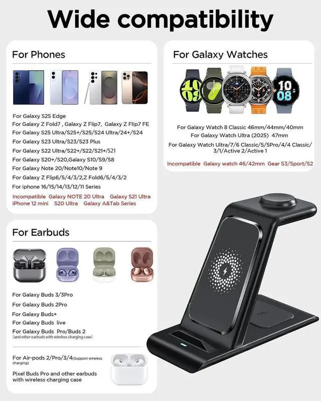 [NOT for GearS3][3 in 1 Wireless Charging Stand] The wireless charger station with dual coils can fast charge your phone buds and watch Galaxy Watch8 Classic 46mm Galaxy Watch8 44mm/40mm Galaxy Watch 7 Ultra 2025/47mm/40mm/44mm/FE 40mm Galaxy Watch 6 40mm/44mm Classic 43mm/47mm Galaxy Watch 5 Pro 45mm/40mm/44mm Galaxy Watch 4 Classic 46mm/42mm/44mm/40mm Watch 3 41mm/45mm/Active 2/1 40/44mm with latest GALAXY WATCH model. NOT for galaxy watch 42/46 Gear S3/S2/Sport/ Watch. [Compact Design & Efficient Convenient] The wireless charger dock features a T-plate design with silicone pads to protect your device from scratches and sliding. galaxy watch charger with built-in magnet can align your watch magnetically.