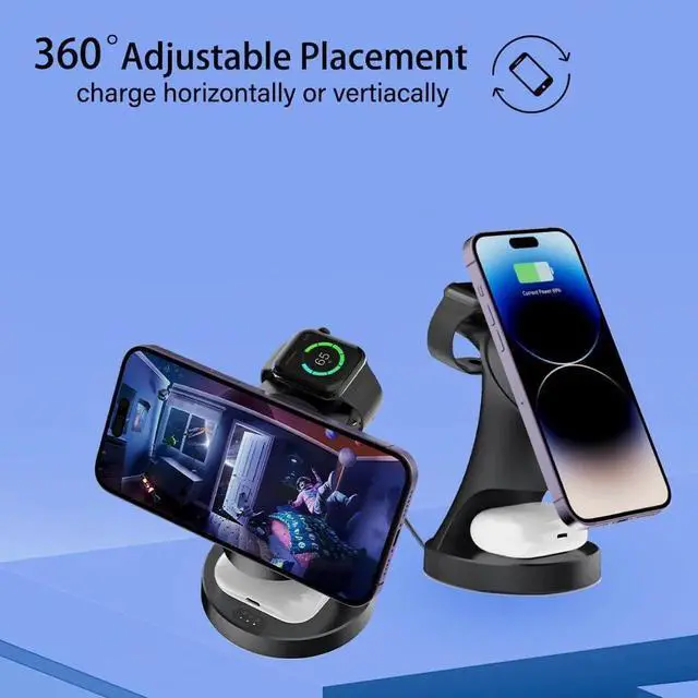 Wireless Charging Station for Multiple DevicesOur magsafe charger stand provides 3 parts to charging your iphone Watch AirPods at the same time. Charging three devices simultaneously and no interfere with each other. Say goodbye to messy desktop and enjoy your life. The fast wireless charging station compatible with iPhone16 15 14 13 12 Pro Max/Pro/Mini/Plus Watch series Ultra10/9/ 8/7/SE/6/5/4/3/2/1Airpods 2/3/Pro.