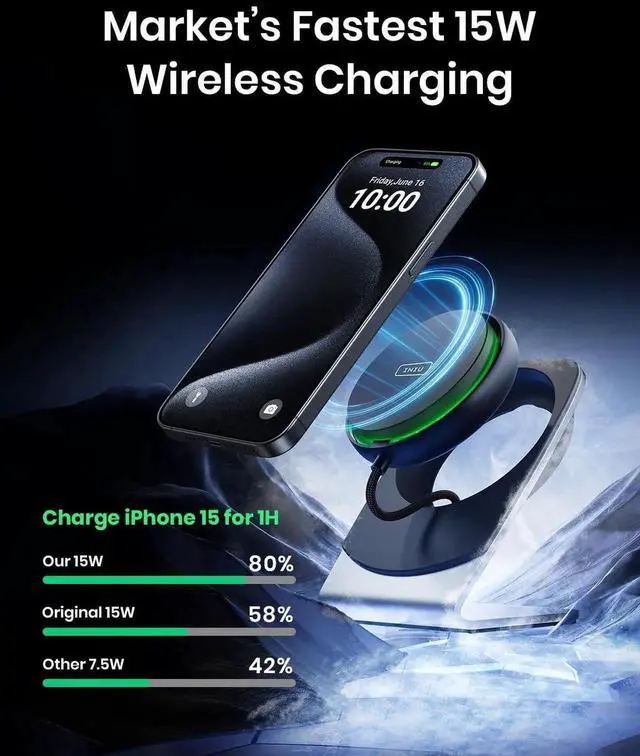 Other Wireless Charger: Powered by the 9-Fin Turbo Cooling Fan it minimizes heat loss enhances charging speed and juices up your iPhone 15 minutes faster than other 15W wireless chargers. Safer Charging with 9-Fin