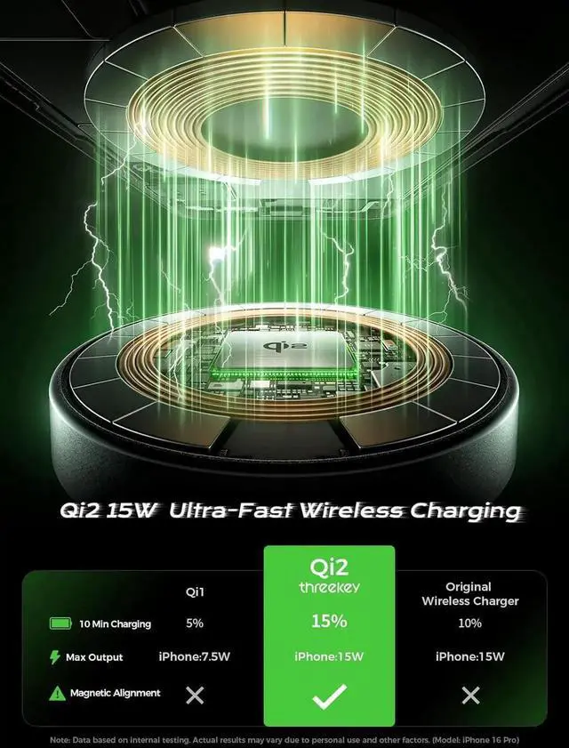 Qi2 certified and MagSafe compatible with 15W powerfor precise alignment and safe fast charging eliminating low battery worries.