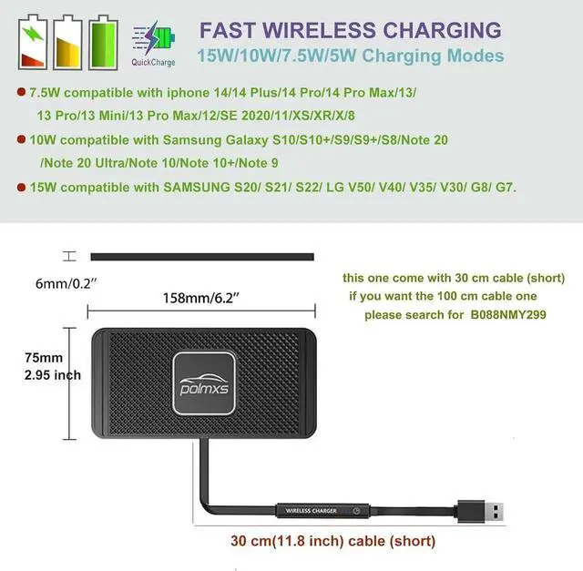 ?? Case Friendly & Large Compatibility wireless phone charger- POLMXS C2Y wireless car charger pad is able to charge through cases up to 4mm in thickness. 15W/10W/ 7.5W fast charging mode the charging pad will automatically match your phones charging speed.?? Note for charger pad use & after sale- Please keep the car wireless charger pad out of the direct sun when the weather is hot high temperature will cause charging speed slow. And QC 3.0 charger is required for fast charging mode. Make sure that no metal objects between the phone and the charging pad.