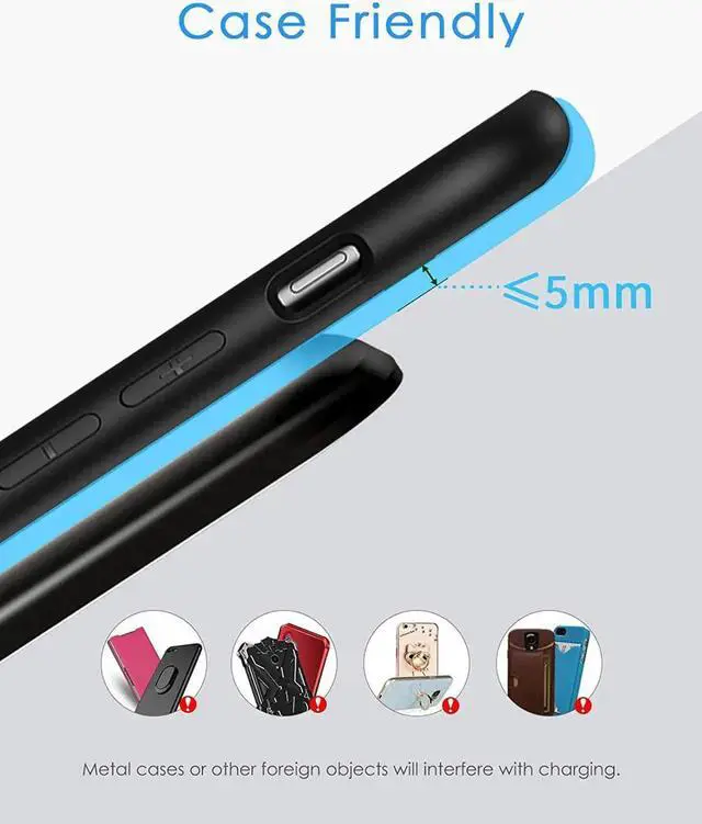 Supports most phone cases not thick than 5mm such as armor case rubber case hybrid case plastic/TPU/PC cases. PLEASE REMOVE ANY METAL AND MAGNETIC ATTACHMENT OR CREDIT CARDS BEFORE PLACING YOUR PHONE. Ultimate Safety Assurance - Features internal safeguards against overcharge overcurrent overvoltage and overheat we ensure ultimate safety for your smartphone anti-slip bottom silicone rim and raised support give extra stability for any desk surface.