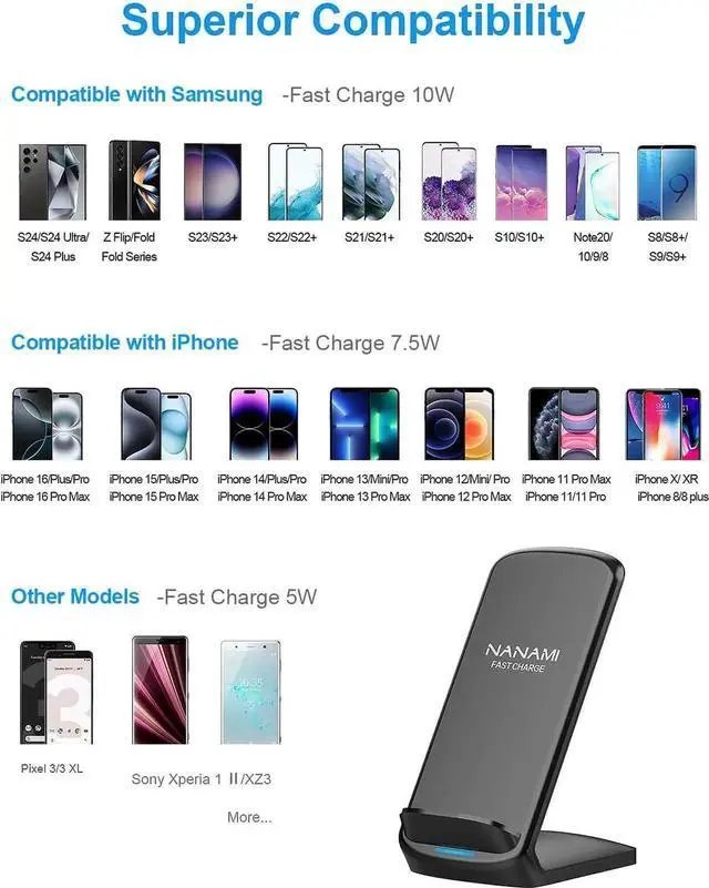 Complimentary with 20W Adapter - A 20W PD USB C charger block will come with this wireless charger stand to improve the charging experience. The compact power adapter supports up to 20W output which can provide the most stable power for the wireless charging. Versatile & Wide Compatibility - Works with all Qi enabled devices and rapidly charging for latest iPhone 16/16 Plus/16 Pro/16 Pro Max/15/15 Plus/15 Pro/15 Pro Max/iPhone 14/14 Plus/14 Pro/14 Pro Max/iPhone 13/13 mini/13 Pro/13 Pro Max/12/12 Pro/12 Pro Max/11/11 Pro/11 Pro Max/XS/XS Max/XR/X/8/8 Plus ( 7.5W ) and for Galaxy S25/S25+/S25 Ultra/S24/S24+/S24 Ultra/S23/S23+/S23 Ultra/S22/S22+/S22 Ultra/S21/S21+/S21 Ultra/S20/S20 Plus/S20 Ultra/S10/S10+/S10E/S9/S9+/S8/S8+/S7/S7 edge/Note 20/20Ultra/10/10+/9/8/5 (10W); 5W standard charging for other Qi enabled phones; add wireless Qi receiver to non-compatible smart phones to achieve wireless charging.