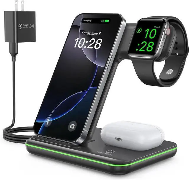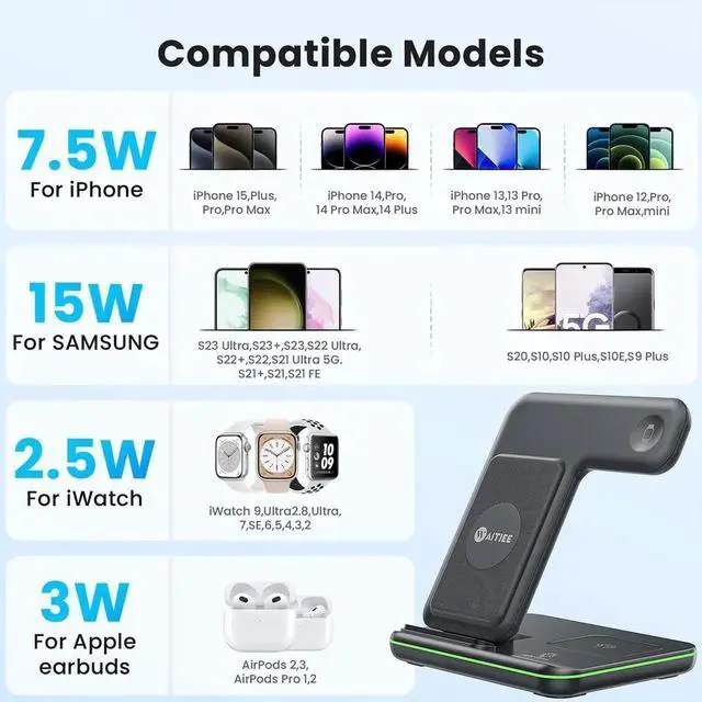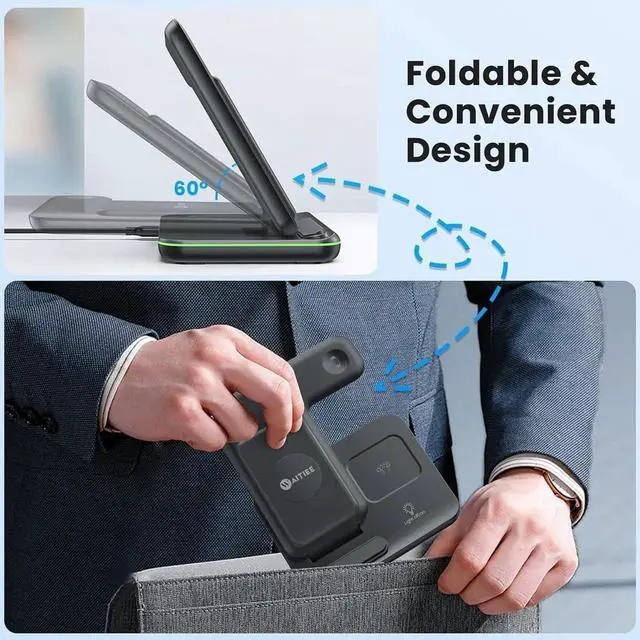 AirPods 2/3/4/Pro/Pro 2 (Note: for AirPods only work with wireless charging case doesn't support with A3058 A2897 A1602 charging case)Foldable & Travel Charger StandThe charger can be folded as a travel charger for multiple devices for. It has a compact size this charging station is space saving for travel can be put in a bag without taking up much space. If you are looking for a wireless charger for to help save space or declutter your desk this is exactly what you need! Safe for