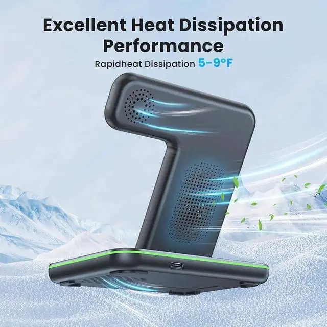Charging: The wireless charger is equipped with multiple protection mechanisms like over-current protection over-voltageprotection over-temperature protection and foreign object detection function to protect your devices. To provide further safety during charging we designed 3 ventilation holes on this wireless charger station. Slip Resistance &Tilt Angle &