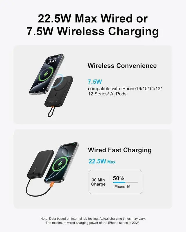 Snap: All-in-one magnetic portable charger combines wired and magnetic wireless charging features. For magnetic power bank supports 5W 7.5W and 15W wireless charging; USB-C ports support Power Delivery up to 22.5 W allowing for fast charging of USB-C enabled devices supporting Quick Charge 3.0 for rapid charging of legacy devices. 10000mAh Magnetic