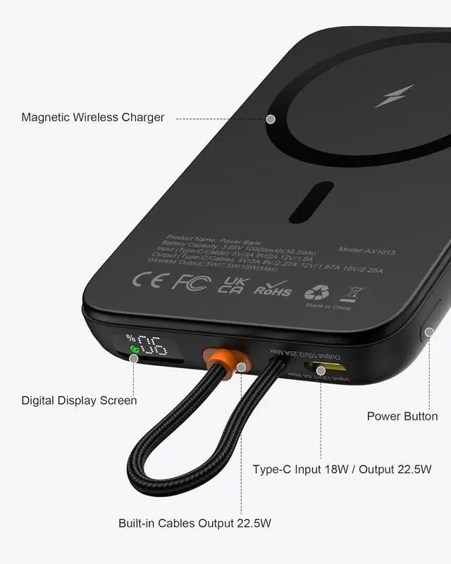What You Get: 10000mAh Magnetic Power bank x 1 USB-C Charging Cable x 1 User Manual x