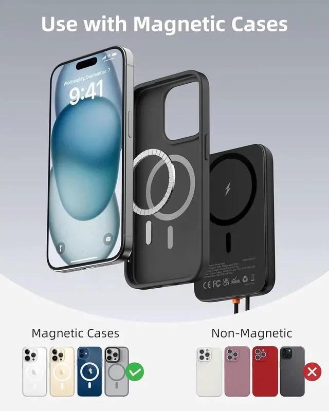 (Note: Slight heating due to efficiency losses in the conversion circuit is normal. )Strong Magnetic Portable Charger & Built-in Type-C Cable: This Magnetic battery pack has built-in USB-C charging cable perfectly compatible with iPhone or Type-C devices no need to carry extra cables; This portable phone charger with the newest magnetic technology can directly hold the back of your iPhone 16/15/14/13/12 Series so you can single-handedly take selfies make calls and more. You can charge your phone anytime and anywhere perfect for travel vacation and camping.