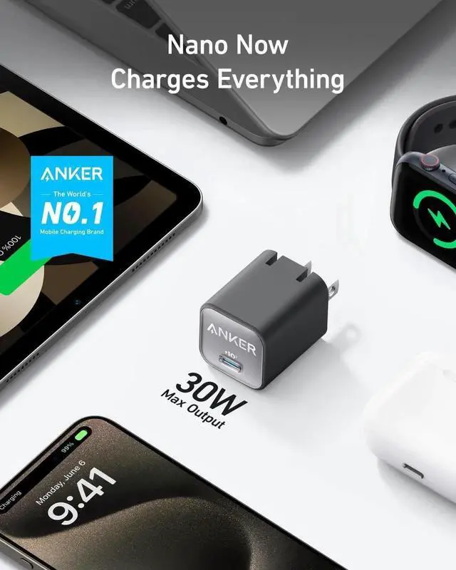 Nano Now Charges Everything: Upgraded with a 30W output so now you can charge your earbuds phone tablet and even your MacBook Air with a tiny charger. a tiny charger.