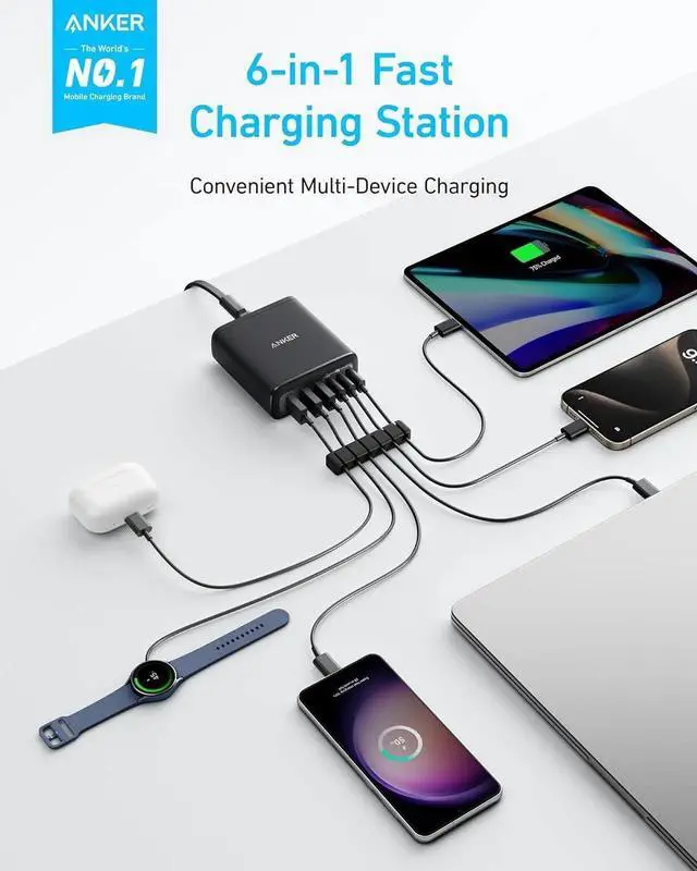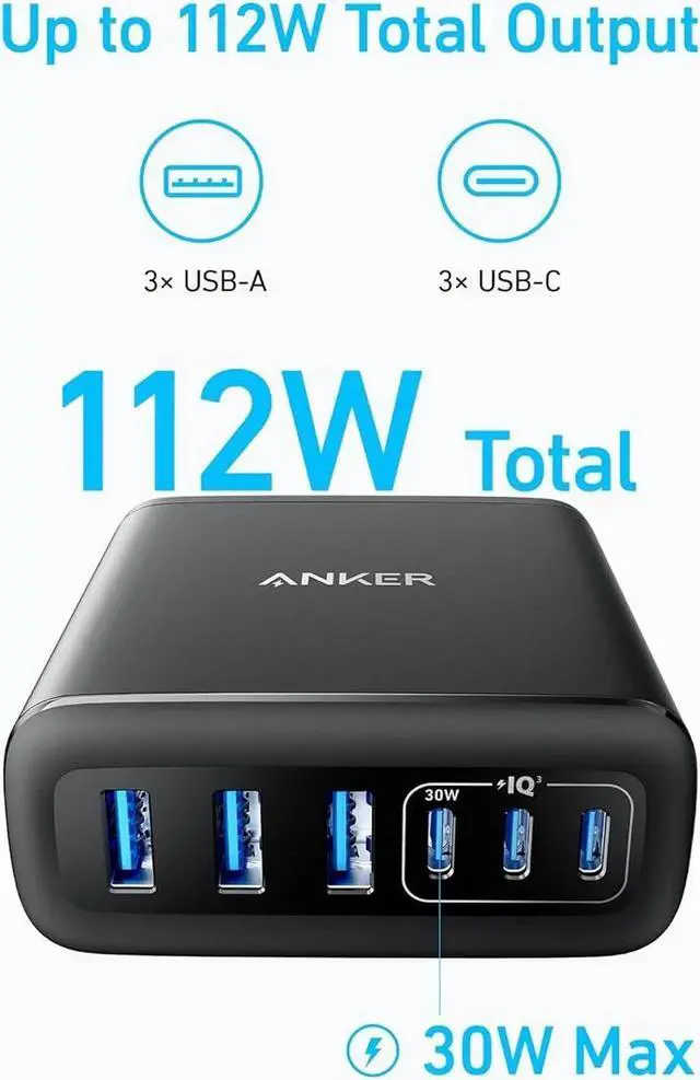 112W Multi-Device Charger: Equipped with 3 USB-C and 3 USB-A ports this charger offers a total output of 112W making it powerful enough to charge a range of devices.