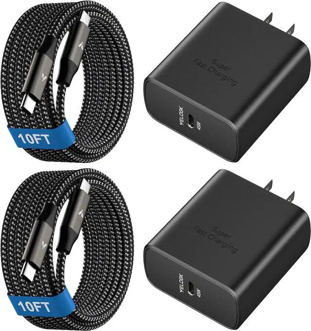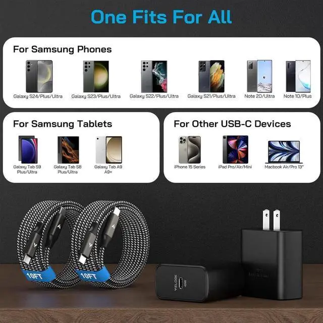45W Fast Charger Type C 2.0 for With latest PPS/PD 3.0 fast charging technology this can charge compatible devices at maximum 45W high speed capable of powering your S25 Ultra/S24 Ultra (5000mAh) to 50% in just 20mins full charge only takes less than 1h; 3x faster than 15W old charger and 40% faster than 25W. 2-Pack 10FT for Charger Fast Charging Cords For Galaxy S25 Ultra/S24 Ultra Charger kit equipped with 2x detachable 100W USB C to USB C cables charge at max 5A super speed 10 feet extra length allows you to freely charge your phones/tablets from any occasions like on sofa/bed or at office.