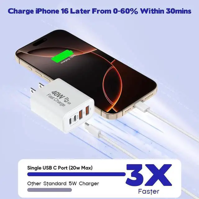 40W Multiport iPhone Charger BlockThe 4-port usb c wall charger for iPhone 16/15 is designed with 2*USB-C port and 2*USB-A port Can Fast Charge 4 Devices Simultaneously at Up to 40W. And 40W USB C iPhone charger is also a great space saver instead of taking up 4 wall outlet ports frees you from messy chargers with various interfacesUniversal