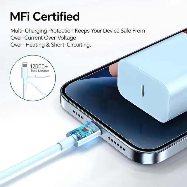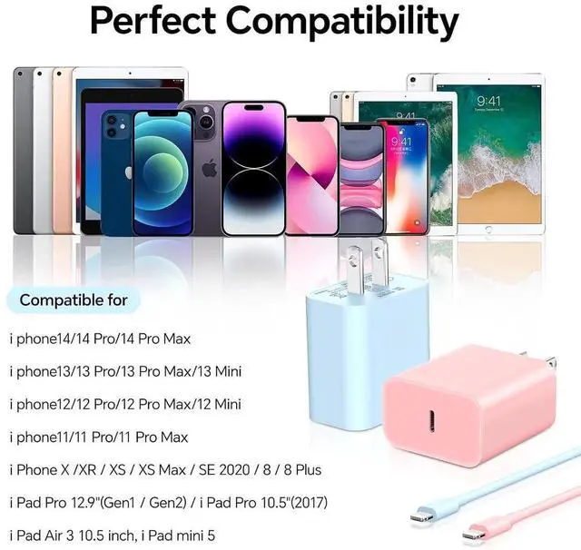 20W Fast ChargerOur colorful phone charger with USB C 20W fast charge from 0% to 50% in just 30 mins. it's 3X faster than the 5W Phone charger. Minimize waiting time and it also support the fast data transfer rates up to 480Mbps. Enjoy your faster charging and data transfering. MFi Certified Lighting CableThe Lighting cable with the original MFi Chip means flawless compatibility with every device. Colorful USB C to Lighting Cable fully supports the iOS version and all future updates. High-quality & DurableThe Phone fast charging cable with a reinforced joint design that has passed 30 000+ times bending tests supporting repeated unplugging for extra protection and durability.