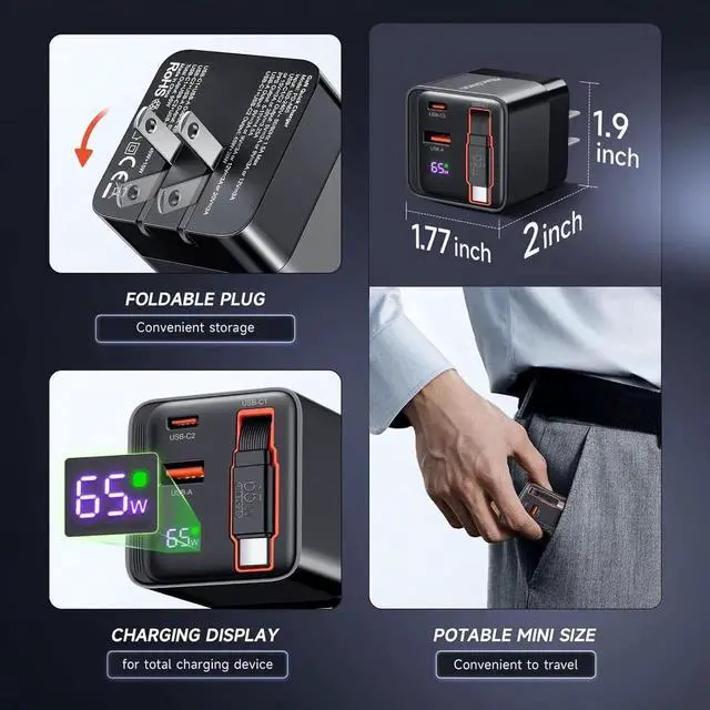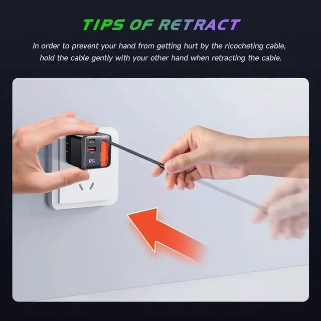 Charging Cable: Comes with a built-in convenient 31.5 inch retractable fast-charging cable ensuring you always have the perfect length and neatly retracts for easy storage and portability. Powerful 65W GaN 3