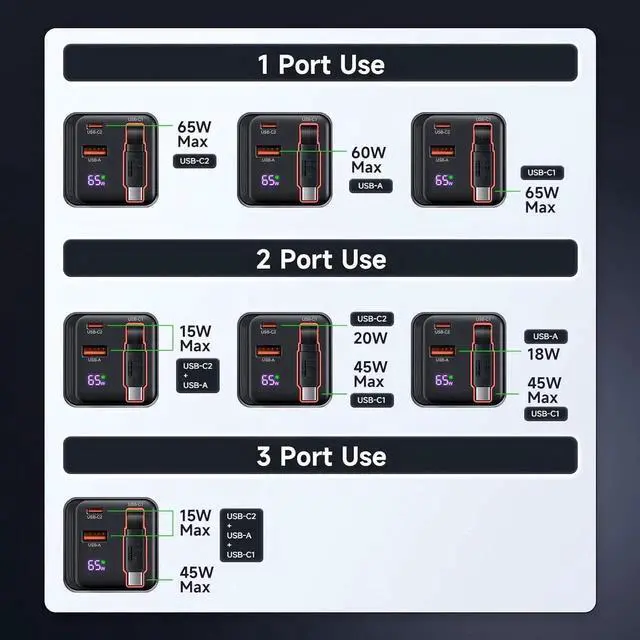 Charging: This wall charger utilizes advanced GaN 3 technology to deliver up to 65W of power for ultra-fast and efficient charging of laptopsMacbook Galaxy Book4 Pro IdeaPad Vivobook HP Chromebook Google Pixelbook XPS and more tablets(iPad Tab Google Pixel Slate Fire HD10/Kindle Fire HD 10 and more) smartphones( iPhone 15/14/13/12/11 Galaxy S24/23/22/21 and more and other electronic devices ensuring fast and efficient power delivery. Charge 3 Devices Simultaneously with