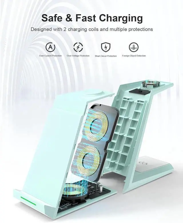& Horizontally Charging]: Built-in 2 high-purity copper charging coils offering no blind spot charging which identifies your phones sensitively. The 3 in 1 wireless charger supports charging phones in vertical or horizontal with a tilt angle design for better watching videos or viewing messages while charging[Sleep Friendly -