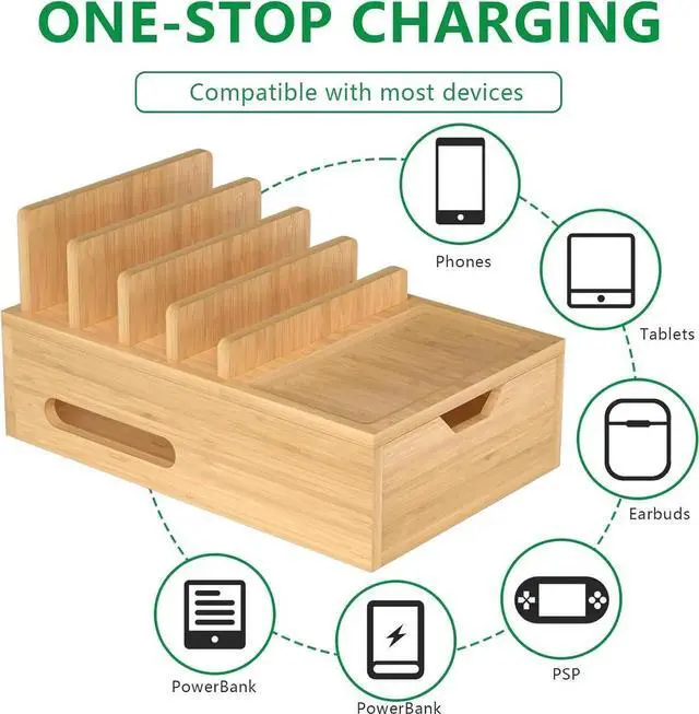 ? Compatible with Multi DevicesIt can accommodate up to 7 devices at the same time and has different slot widths. Whether it's a tablet power bank phone headphones and game player our charging station has got you covered.? Suitable for Multi OccasionsThis charging Organizer is larger than others and has great storage and organization capabilities. It is perfect for offices classrooms restaurants hotels and homes that have multi devices and items and keep them neat and tidy. The bamboo desk organizer is also suitable as a gift for family friends and colleagues.? What You Get1 docking station 6 data cables (including 3xiPhone cables 2xType-C cables and 1xAndroid cable) to ensure compatibility with various devices.