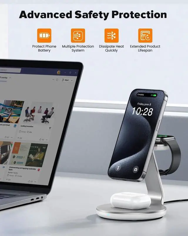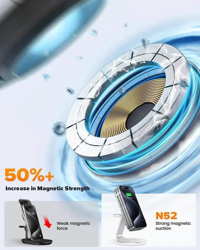 Magsafe Charger: The 3 in 1 magnetic wireless charger station has newly upgraded magnetic suction which enables instant charging of iPhone and increases charging efficiency by 25% bringing you a fast and stable magnet wireless charging experience. This wireless charger stand compatible with magsafe Charger is specially designed for iPhone16/15/14/13/12 series It is recommended to wear a magnetic phone case or no case. Wireless Charging Strong
