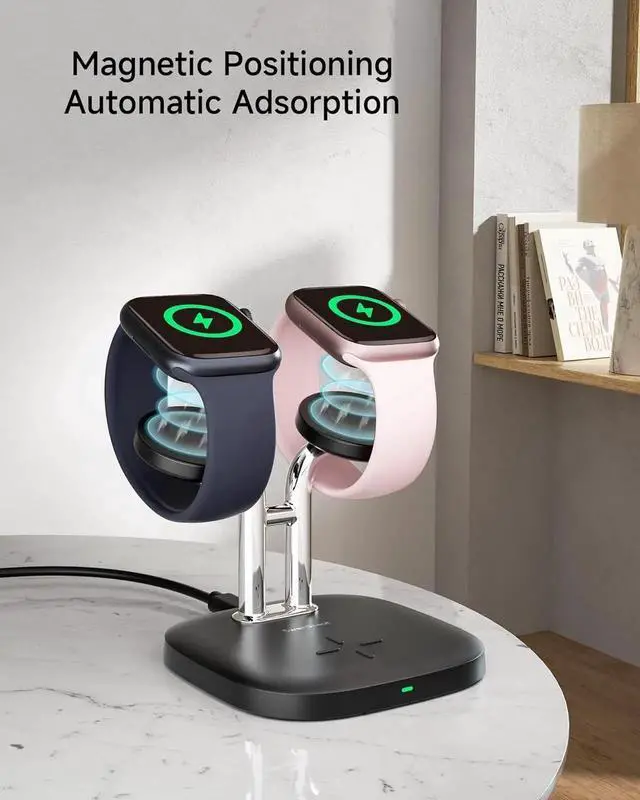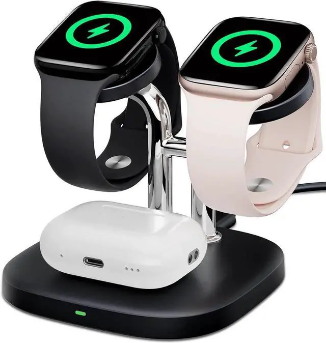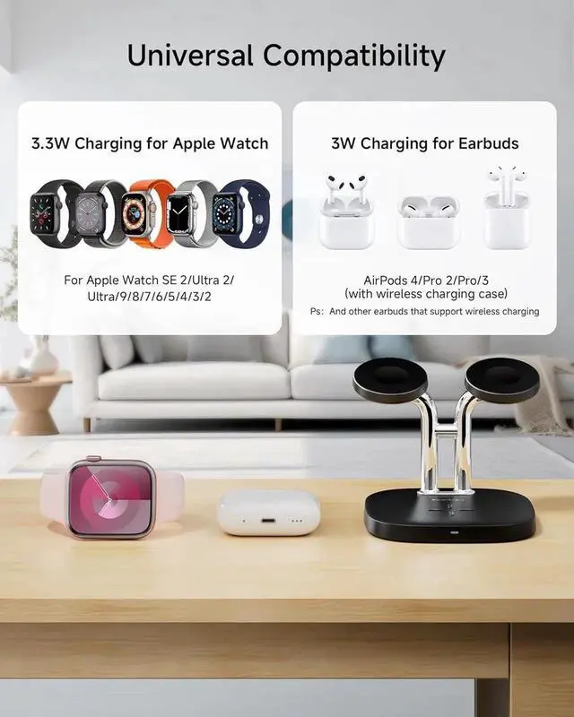 Wide Compatibility: The 3 in 1 watch charger stand is compatible with Watch Ultra 2/Ultra/10/9/8/7/SE/SE 2/6/5/4/3/2 AirPods 4 (ANC) /3/Pro 2/Pro and other wireless-charging-enabled earbuds.