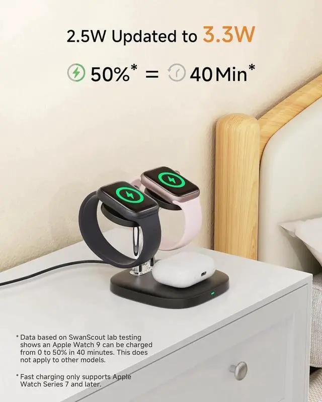 Fast Charging Upgrade: The SwanScout 704A has upgraded the watch charging power from 2.5W to 3.3W enabling the Watch 9 to reach 50% in 40 minutes and reducing the Watch Ultra 2's full charge time by nearly 2 hours.