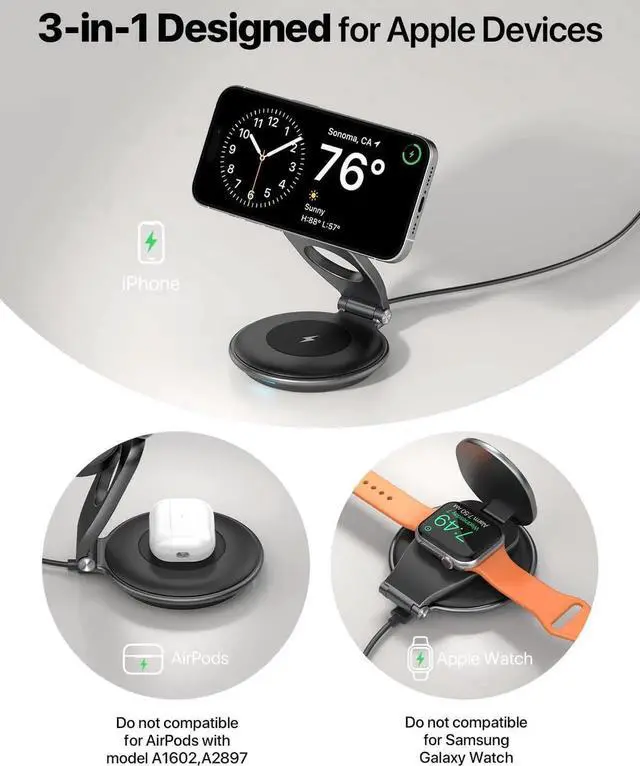 Plug: Equipped with a 30W adapter our wireless charger offers fast charging for iPhone AirPods and iWatch. Say goodbye to tangled wires and enjoy high-performance for MagSafe charging.