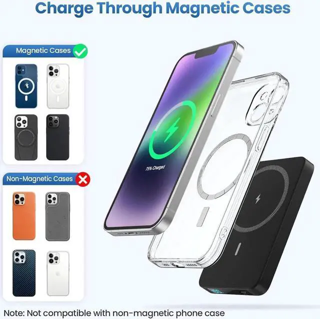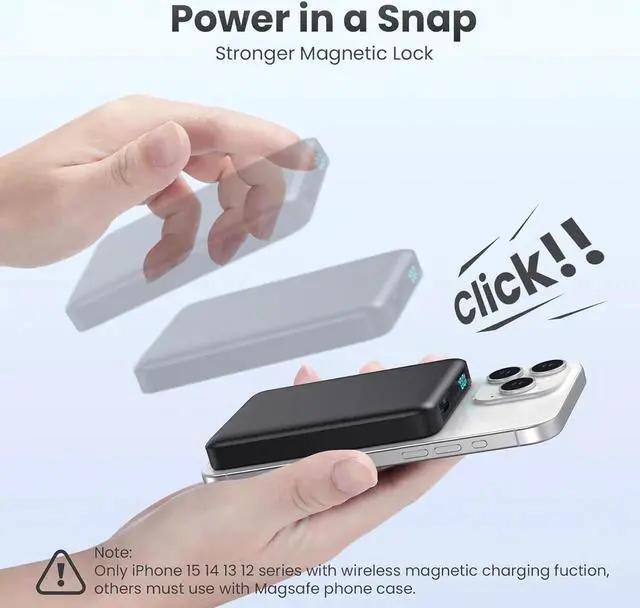 Magnetic Charging for iPhone 16/15/14/13/12 SeriesThis magnetic portable charger is special designed for iPhone 16/16 Plus/16 Pro/16 Pro Max/iPhone 15/15 Plus/15 Pro/15 Pro Max/14/13/12 series and mag-safe case. In addition the USB-C power bank can charge your other devices by charging cable at the same time while magnetic charging. Snap-Charge-GOOur magnetic battery pack built-in massive 10800mAh battery capacity you can fully charge iPhone 15 Pro up to 1.9 times so you always stay in flow. With this mag-safe portable charger you can enjoy video call videos music and selfies anytime anywhere without the hassle of wires perfect for vacation travel and camping.