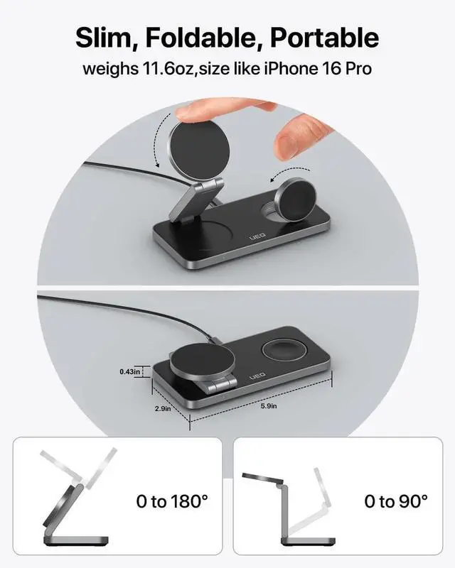 The LED indicator light is weak while charging and won't disturb your sleep. What You GetUEQ 3-in-1 Magnetic Wireless Charger Stand*1 20W USB-C charger*1 USB-C to C cable( 3.3 ft/1m)*1 User Manual*1 and our friendly customer service. Our 3 in 1 wireless charging station is also an ideal gift for family and friends. Compatible with iPhone charging station.