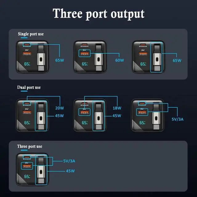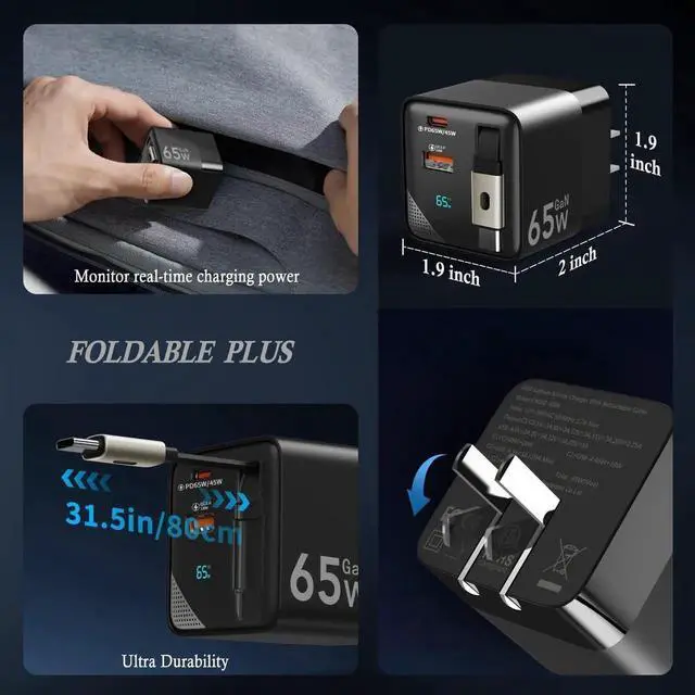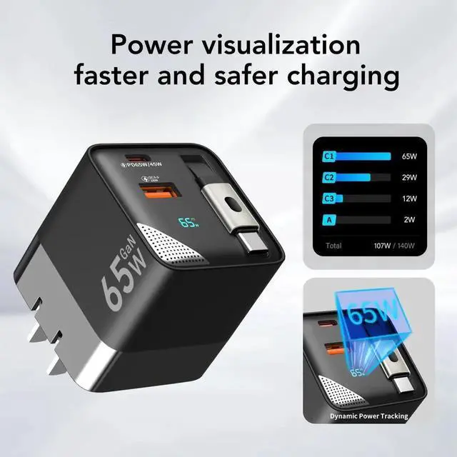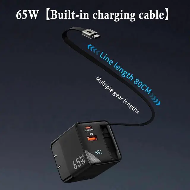 [Innovative Retractable Type-C Cable and Folding Plug Design] The 65W retractable wall charger block comes with a built-in convenient 31.5 inch retractable fast-charging USB C cable. It can be automatically retracted with a slight pull keeping neat and tidy at your home or office. The folding plug design allows you to easily store usb-c charger during travel as well. [Upgraded 3-in-1 Fast Charger for Three Devices] Equipped with a real PD 65W USB-C cable a type-c port and a USB-A port can power up 3 devices simultaneously at high speed. No need to wait and easy to use.