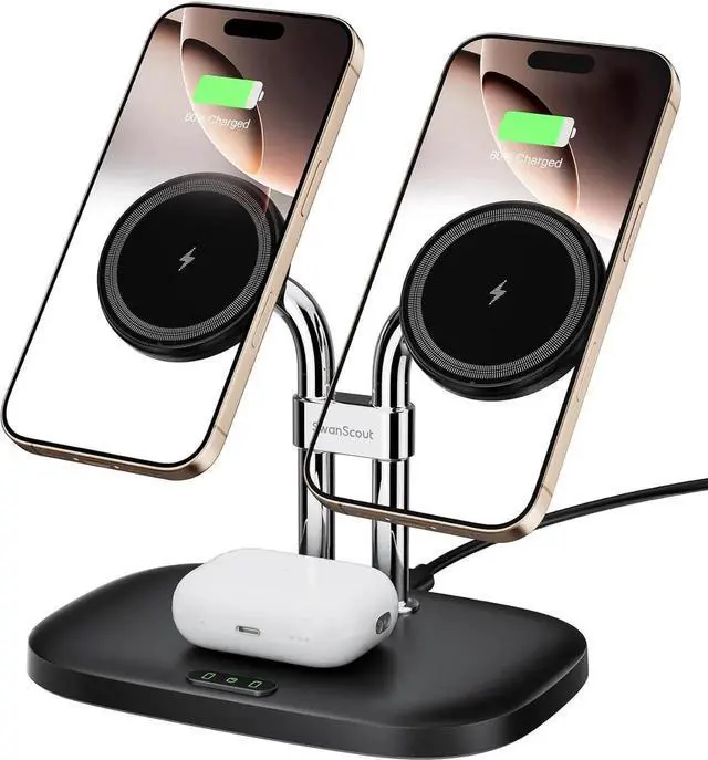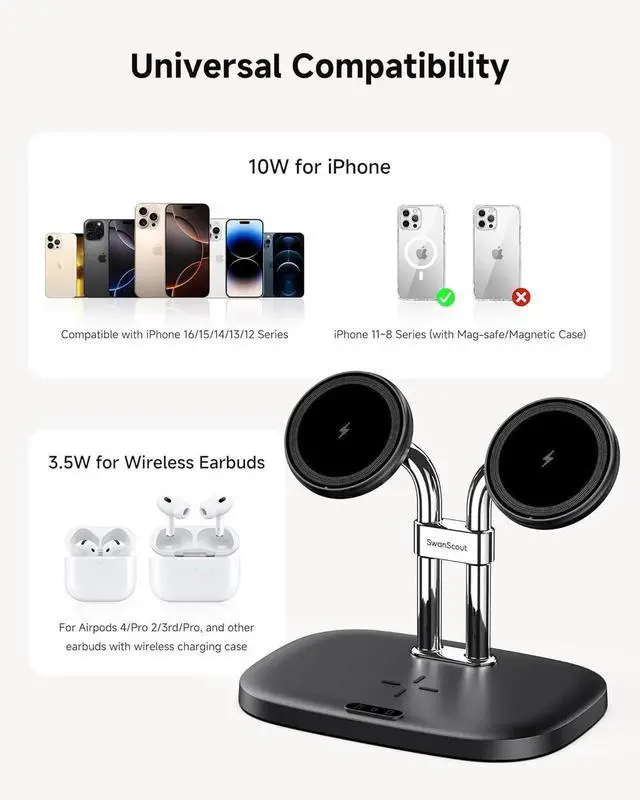 Design: The inclusion of a wireless charging pad for Earbuds adds to the convenience. The SwanScout 706M provides a perfect and compact solution for organizing charging space reducing clutterCompatibility: The SwanScout 706M is compatible with iPhone 16/15/14/13/12 Series and designed for 2nd/Pro AirPods 4/3rd. Other compatible devices are listed in the product imagesEfficient