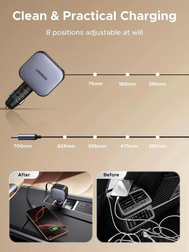 PD 3.0 /QC 3.0: The built-in USB-C cable delivers an output power of up to 60W. Both the USB-C and USB-A ports support up to 30W. UGREEN retractable car charger is your ideal travel companion3-in-1