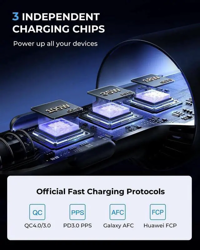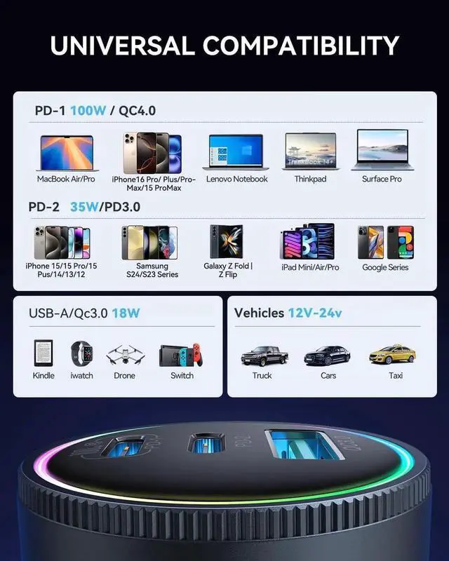 No need to waitenjoy the convenience of quickly charging multiple devices at once. With three independent charging chips it provides stable and efficient power output to each port making it the perfect energy companion for your road trips! 100W Fast charging USB C Cable & Stylish Rainbow LED LightsThe 2025 upgraded car phone charger includes a 4-foot high-speed 100W USB C to USB C cable so you no longer need to carry extra cables. Its perfect for iPhone 16 series and supports PD 4.0 / 3.0 and QC 5.0 / 4.0 fast charging. The iphone 15 car charger also features soft colorful LED ambient lights making it easy to locate the charging port in the dark and enhancing your driving experienceOutstanding Heat Dissipation & SafetyThis 3-port Car Charger USB C eatures a unique metallic spray-painted exterior combined with advanced PC materials and carefully designed ventilation openings.