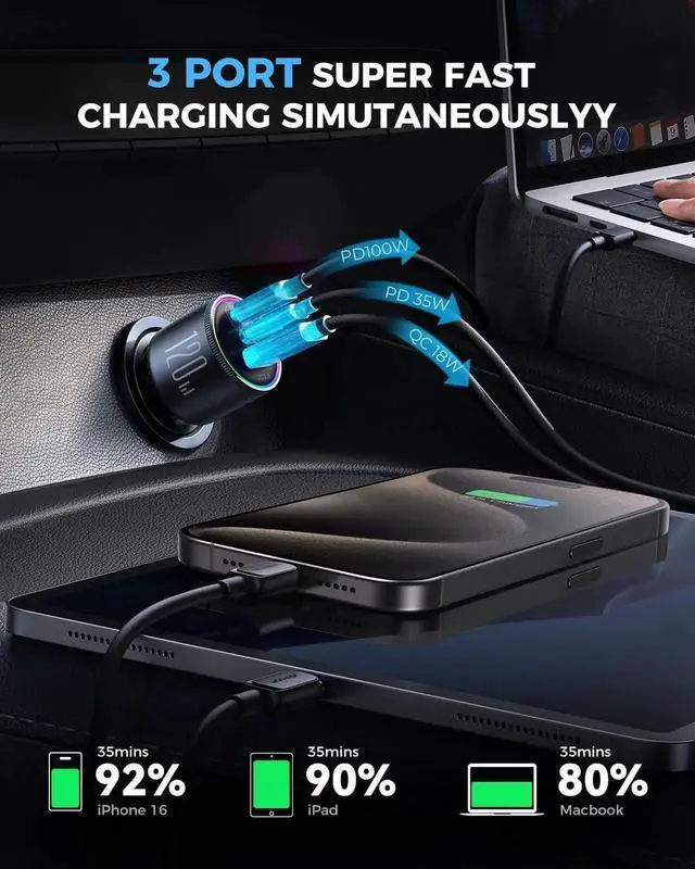 PD 3.0 & QC 4.0 Super Fast Charging120W Ultra-Fast USB C Car Charger supporting QC 4.0 PD 3.0 PPS and QC 3.0 fast charging protocols fully compatible with all devices. The JOYROOM iphone 16 car charger fast car charger charges your iPhone 16 from 0% to 92% in just 35 minutes and fully charges MacBook or iPad Air in approximately 50 minutes. With up to 20V output in a 12V car this charger delivers ultra-fast efficient charging for laptops and other devices saving you valuable time on long journeysSimultaneously Fast Charge 3 DevicesThe JOYROOM 120W (Max) Super Fast Car Charger is equipped with dual PD ports (USB-C 100W + 35W) and a QC 3.0 port (USB-A 18W) ensuring that even with three devices charging at once each device receives ultra-fast charging without any power drop.
