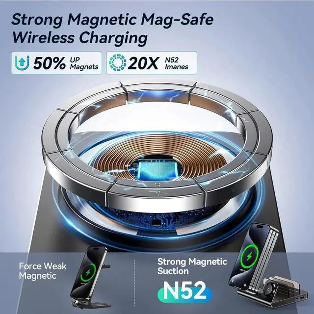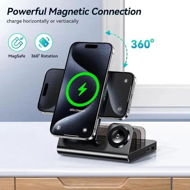 15W Wireless Charging: The iPhone can charge up to 15W wirelessly and the Airpods/iWatch can charge up to 3W wirelessly (wireless charging is only available for devices that support Magnetic). The Qi-certified high-power chipset can intelligently distribute charging solutions and the back is designed with vents for rapid heat dissipation to improve mobile phone charging efficiency. Strong Magnetism & 360°Angle