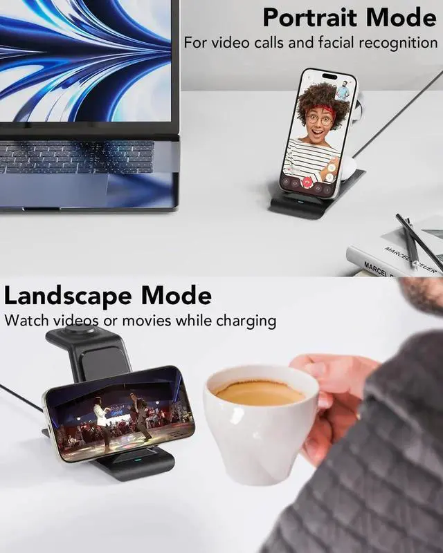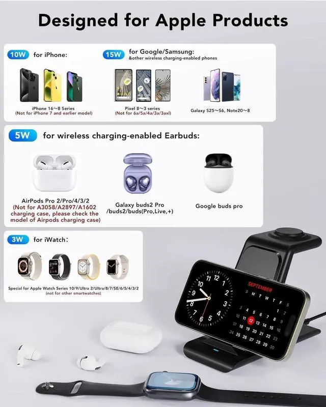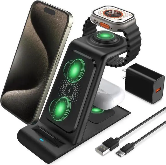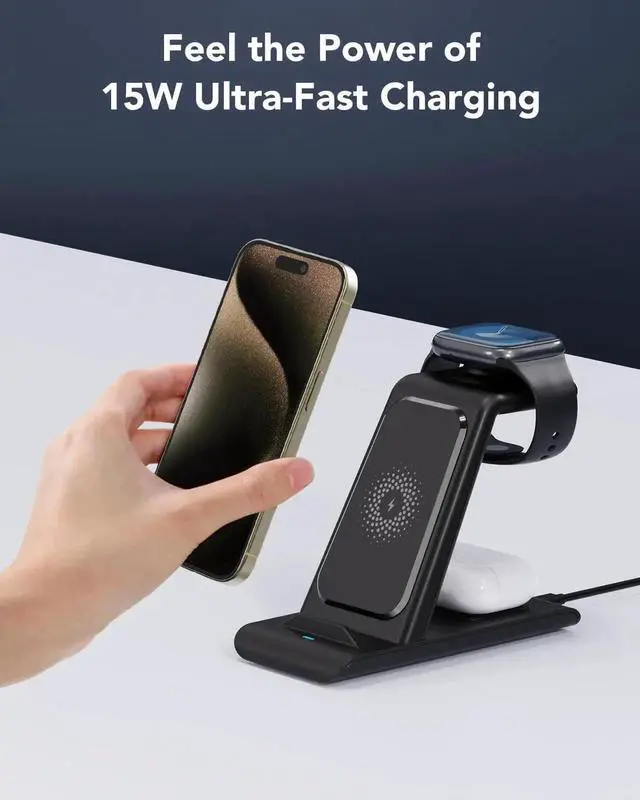 Design]: This 3 in 1 wireless charger focus on practical convenient elegant and durability in the past 2 years our designers designed this high-quality high-convenient watch charger wireless charging station follow rigorous design concept continuous improvement and thousands of tests. In the future we still will constantly update products according customer using experience and market changes and do our best to serve customers[Efficiency