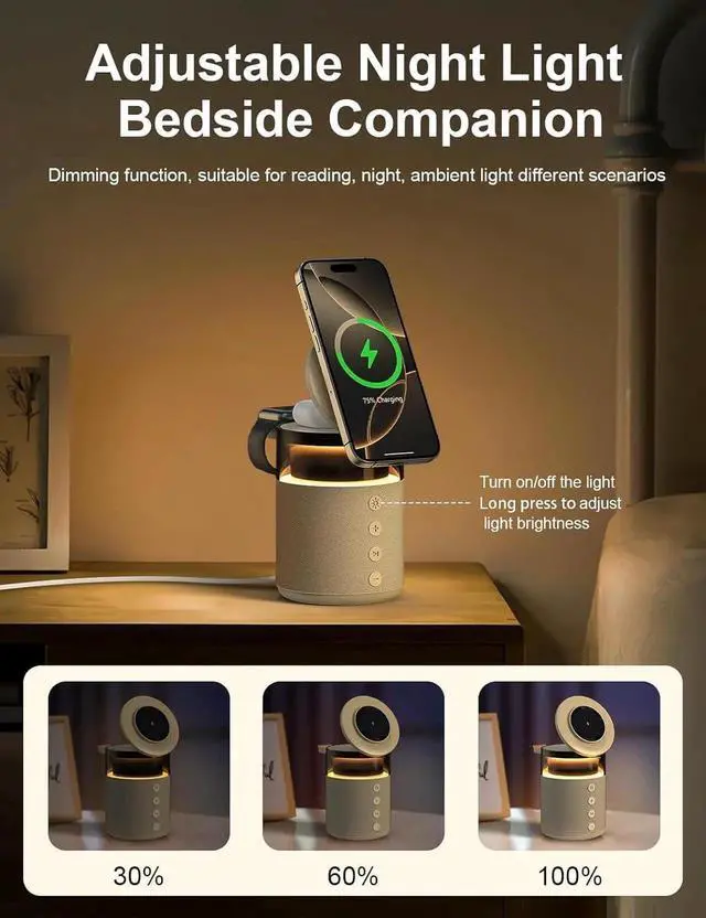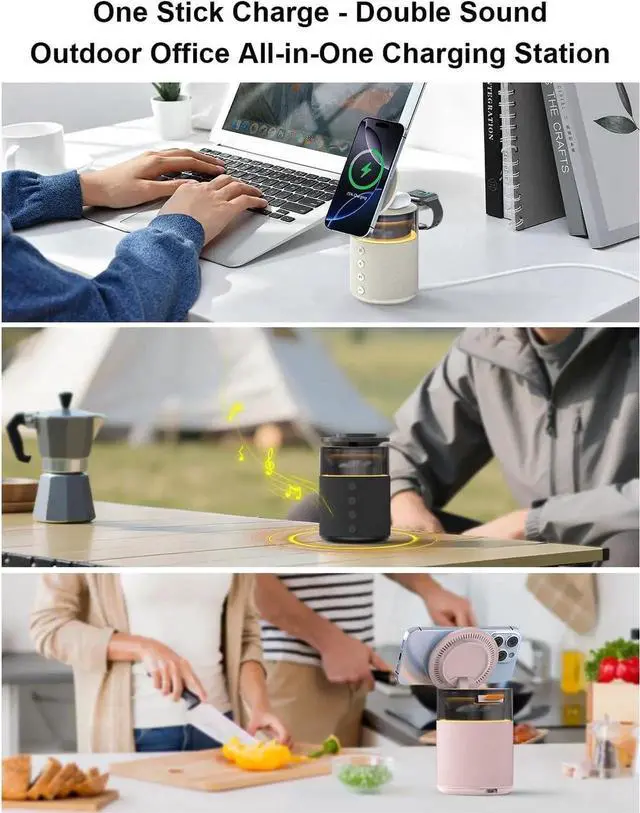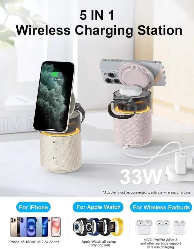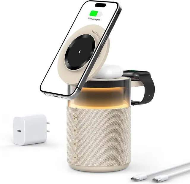 1. 5-in-1 Multifunctional PowerhouseSeamlessly combine magnetic fast charging for iphone Wireless earbuds and iWatch charging a premium stereo speaker and a button-controlled night light. This all-in-one solution eliminates tangled cables and replaces multiple devicesideal for home office travel or camping. 2. Upgraded 3-in-1 Magnetic Charging StationUpgraded from 2-in-1! Effortlessly charge iPhone iWatch and Wireless Earbuds simultaneously. Adjust your phone vertically or horizontally for hands-free video watching messaging or photography. Powerful magnets ensure perfect alignment for efficient charging. 3. Dynamic Stereo Speaker with Bluetooth 5.4D eliver thumping sound with rich bass and immersive audio via Bluetooth 5.4 offering extended range and stable connections.