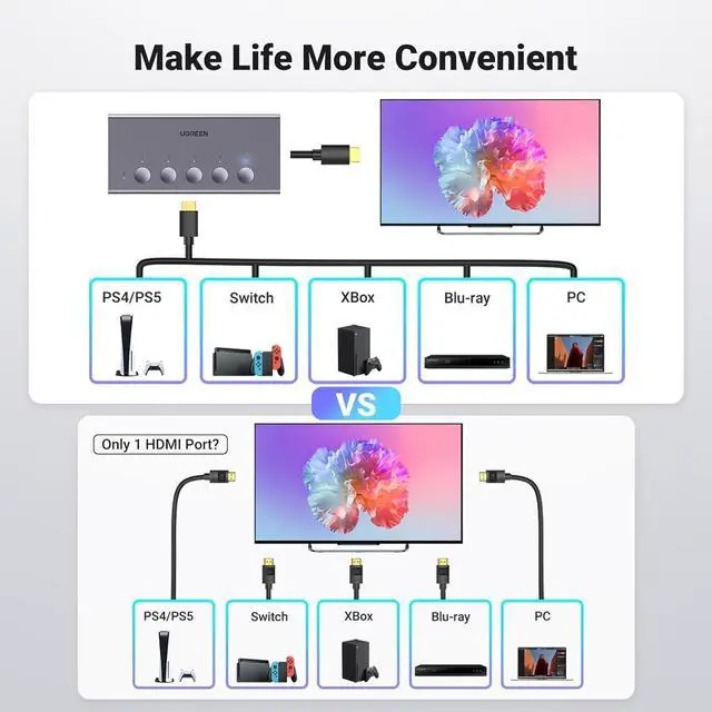Designed for Multiple Gaming Consoles: Are you tired of constantly switching among multiple gaming devices on your TV? UGREEN HDMI Switch 5 in 1 out makes it a breeze! Connect 5 of your favorite gaming devices such as PS5, Xbox, Switch, Roku, and laptop to your TV with just one input port