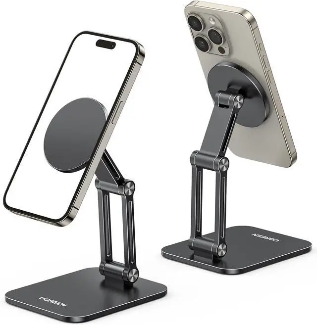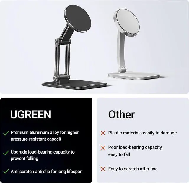 Powerful Magnet: UGREEN magnetic phone stand for desk built-in strong magnets that firmly fix iPhone 12 and above devices or MagSafe accessories to phone stand. Only need to bring the device close to the Magsafe cell phone stand, and it will be accurately and firmly absorbed by phone stand, making it easy to install and disassemble in one second. It is more convenient and safer than traditional phone stands. Please note that this product does not support MagSafe charging !!!