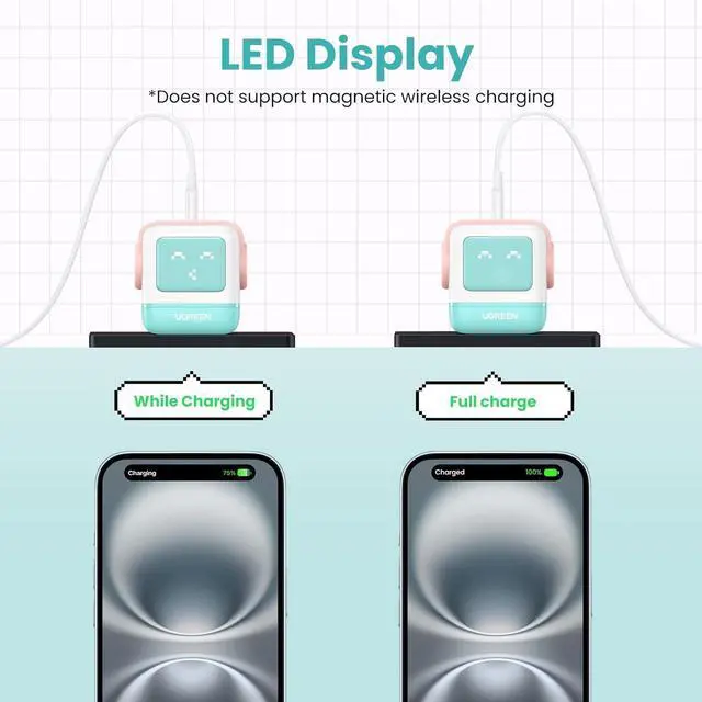 UGREEN Uno charger: UGREEN creative series charger, robot shape, LED screen, showing different interesting expressions according to different charging status. Its feet are magnetic and can be stuck on the refrigerator or computer without getting lost( Note: The expression will only appear when the power is on.)