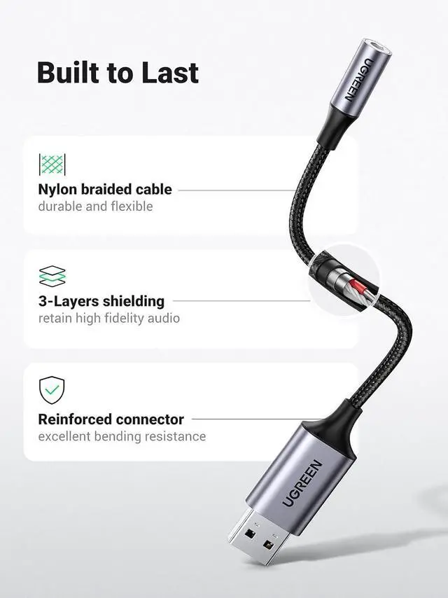 Built to Last: With aluminium alloy shell, the Aux to USB adapter is more durable and portable than other plastic USB audio adapter. Nylon braided design of USB to audio jack adapter ensures stable audio transmission. 10000+ bend tests prove that USB headset adapter can prevent damage caused by tangling and scratching