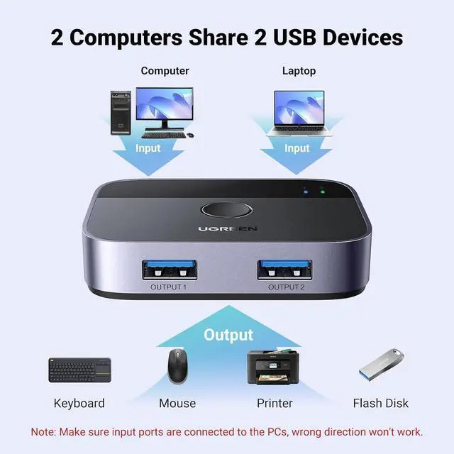 2 PCs Share Multiple Devices: UGREEN 2 in 2 out USB switch supports 2 computers sharing 2 USB devices like keyboards, mouses, printers, webcam and more. Switch freely between your work computer and personal laptop, boost your work efficiency.