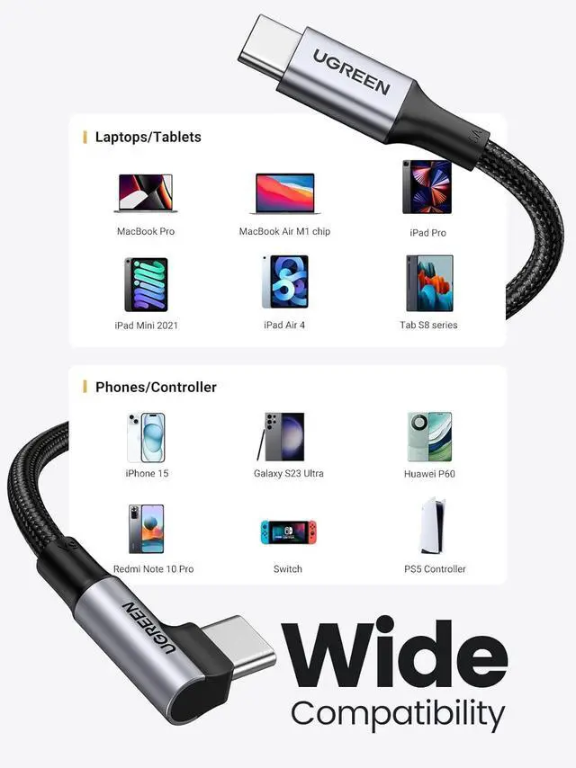 Broad Compatibility: This UGREEN type C to type C cable is compatible with USB-C devices, such as iPhone 15/15 Plus/15 Pro/15 Pro Max, Macbook, iPad, Google Pixel, Samsung Galaxy S24/S23/Note 20/Note 10+ and etc