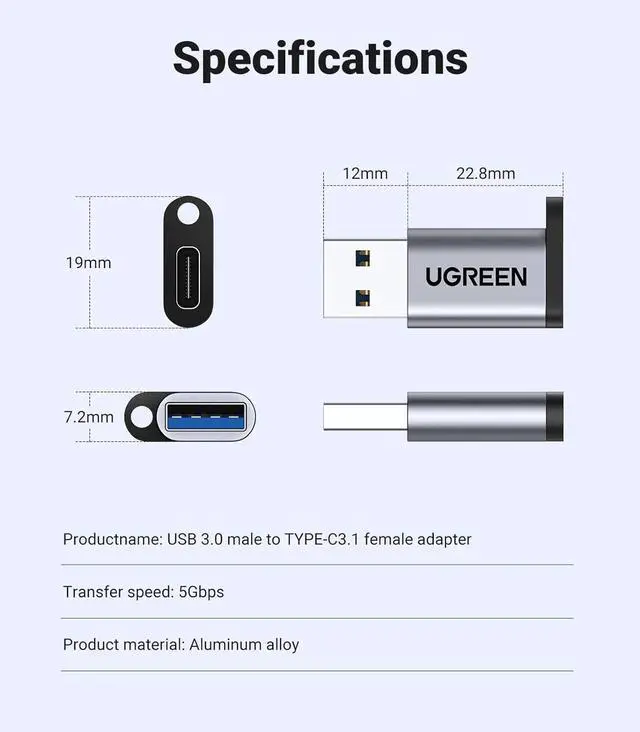 Durable & Mini-sized: UGREEN USB C female to USB male adapter is equipped with an aluminum alloy case and built-in 56K resistance to protect the internal circuit structure, ensuring safe and fast charging with excellent performance. The size of the type c charger converter is 35mm×12mm, which takes up very little space and is easy to carry around