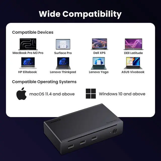 Widely Compatible: The Thunderbolt 4 Hub is compatible with most Thunderbolt 4, Thunderbolt 3, USB4, or USB-C computers or tablets, including Macbooks(macOS 11.4 & above), Windows laptops(Windows 10 & above), mac mini, or other tablets with USB-C ports. Note: Full-featured USB-C laptops/tablets only support a single display. Not compatible with Mac mini 2018(intel).