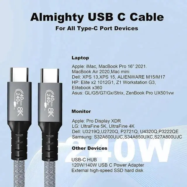 40Gbps High Data Transferring: The USB C to USB C cable compatible with Thunderbolt 4 cable, with data transfer speeds of up to 40Gbps. (Note: Data transfer device needs to support 40Gbps. )