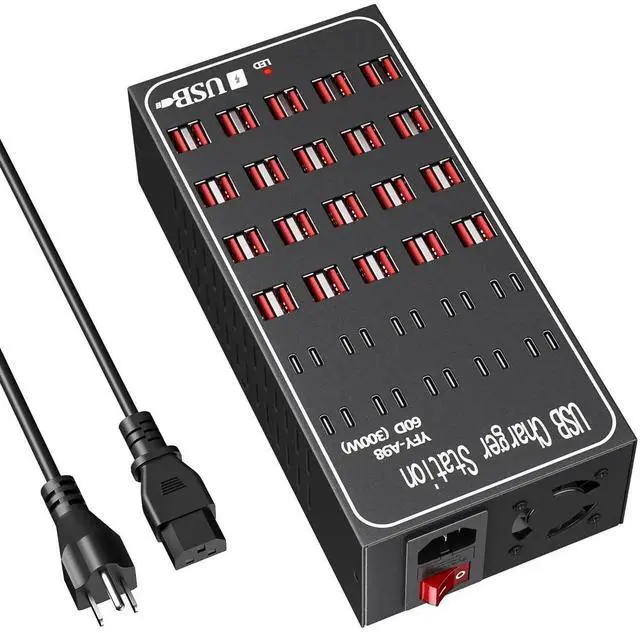 Power up your entire device collection with this robust 60-port USB charging station. Delivering an impressive 300W (60A) of total power output, this versatile charging hub efficiently handles multiple devices simultaneously. The sleek black design features organized port arrangement for neat cable management and clear device organization. Each port provides optimal charging capability for various devices including latest iPhone models, iPad Pro, Samsung devices, tablets, and other USB-C compatible gadgets. The compact desktop form factor makes it perfect for offices, classrooms, or home charging stations where multiple devices need simultaneous charging. The sturdy construction includes built-in safeguards while the clear port labeling ensures easy device connection. This charging station combines convenience with high-capacity power delivery, making it an ideal solution for managing multiple device charging needs in one centralized location. The included power cable allows for easy setup, while the power switch provides convenient control over the entire charging station.