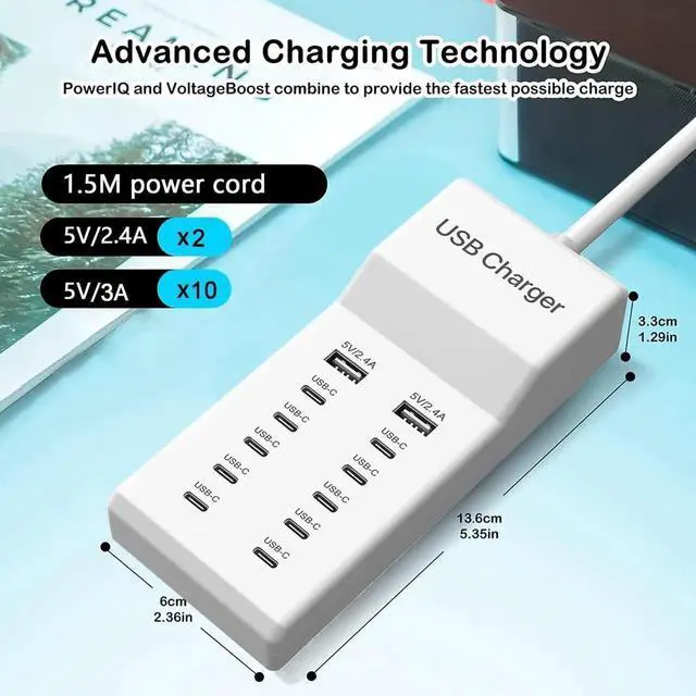 ![Main image of JAENFONG USB C Charger, 12 Ports USB Charging Station, 60W MultiPort Charger[10 USBC+2 USBA], Compatible with iPhone/iPad/Samsung/Google Pixel/Watch/Headphones](https://c1.neweggimages.com/productimage/nb640/C1E6S2510100FTGW740.jpg)