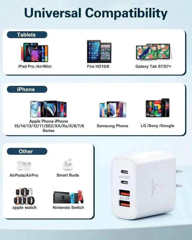 | Compatible Phone Models | iPhone 16/16 Plus/16 Pro/16 Pro Max/iPhone 15/15 Plus/15 Pro/15 Pro Max/iPhone 14/14 Plus/14 Pro/14 Pro Max/13/13 Mini/13 Pro/13 Pro Max/12/12 Mini/12 Pro/12 Pro Max/11/ 11 Pro/11 Pro Max/XS Max/XS/XR /X/8/8 Plus/7/7 Plus/6/6S/SE/iPad mini/pro/air, Samsung Galaxy S23/S23+/S22/S21/S10/S9/S8 Plus/A12/A13/A22/A32/A52/A53/A71/S8/S7/S6, Huawei, LG,Motorola,Sony, Google Pixel, Airpods, Nintendo Switch, PS5, Watch, Kindle, Table |