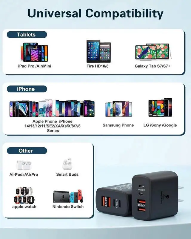 | Compatible Devices | iPhone 15/15 Plus/15 Pro/15 Pro Max/iPhone 14/14 Plus/14 Pro/14 Pro Max/13/13 Mini/13 Pro/13 Pro Max/12/12 Mini/12 Pro/12 Pro Max/11/ 11 Pro/11 Pro Max/XS Max/XS/XR /X/8/8 Plus/7/7 Plus/6/6S/SE/Pad mini/pro/air, Galaxy S23/S23+/S22/S21/S10/S9/S8 Plus/A12/A13/A22/A32/A52/A53/A71/S8/S7/S6, Huawei, LG,Motorola,Sony, Google Pixel, Airpods, Nintendo Switch, PS5, Watch, Kindle, Tablet, etc |