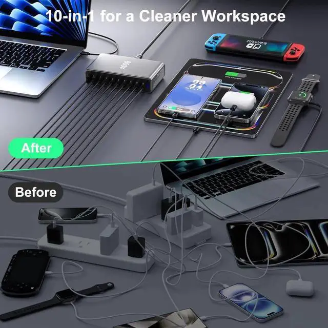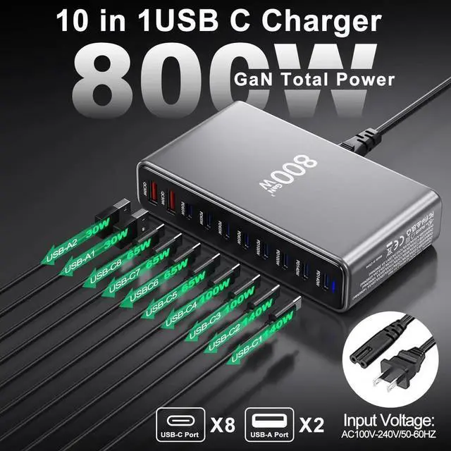 Power up your entire tech arsenal with this robust 800W GaN charging station. Featuring 10 versatile ports, including multiple USB-C PD outputs ranging from 65W to 140W and QC30W ports, this charging hub is a powerhouse for simultaneous device charging. The advanced GaN technology ensures efficient power delivery while maintaining a compact, sleek design with a professional gray finish. Perfect for charging laptops like MacBook Pro/Air, tablets, smartphones, and other USB-C compatible devices, this charging station eliminates cable clutter and the need for multiple adapters. The thoughtfully designed vertical stand saves desk space while providing easy access to all ports. Each port is clearly labeled with its power output specifications, making it simple to choose the right connection for your device. The included power cable and durable construction make this an ideal charging solution for home offices, workstations, or anywhere you need comprehensive charging capabilities for multiple devices.